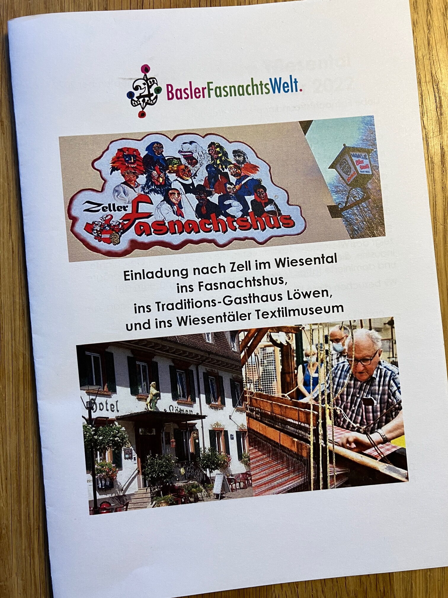 Am Samstag, 29. Oktober besuchen wir anlässlich der Mitgliederreise 2022 zusammen das 'Zeller Fasnachtshus'. Dort erhalten wir vom Gründer und Betreiber Peter Zluhan eine Führung durch die Ausstellung. Auch die Kehle soll laut Versprechen nicht austrocknen. Danach gehts in den Löwen, um uns nach der intensiven Führung mit einem feinen Mittagessen zu stärken. Am Nachmittag schauen wir das Wiesentäler Textilmuseum an - erneut mit einer engagierten Führung. Dies klingt nach einem vielversprechenden Programm - gerne dürfen auch Partner*in oder persönliche Bekannte angemeldet werden.
